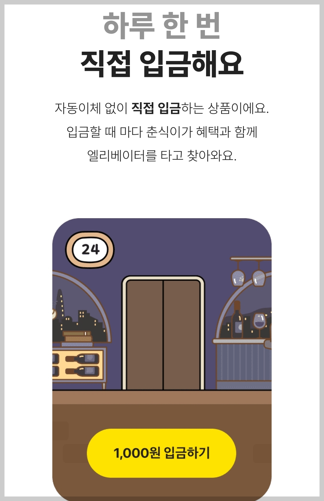 #카카오뱅크 #한달적금이란 하루 한 번 매일 자동이체 없이 가입자가 직접 설정한 금액을 입금하는 성품입니다. 입금할 때 마다 귀여운 춘식이가 혜택과 함께 엘레베이터를 타고 건물 한층이 올라가요. 하루에 한 번씩 매일 꾸준히 입금하다 보면 보너스 우대금리를 주는데 한달에 6번 받을 수 있답니다.