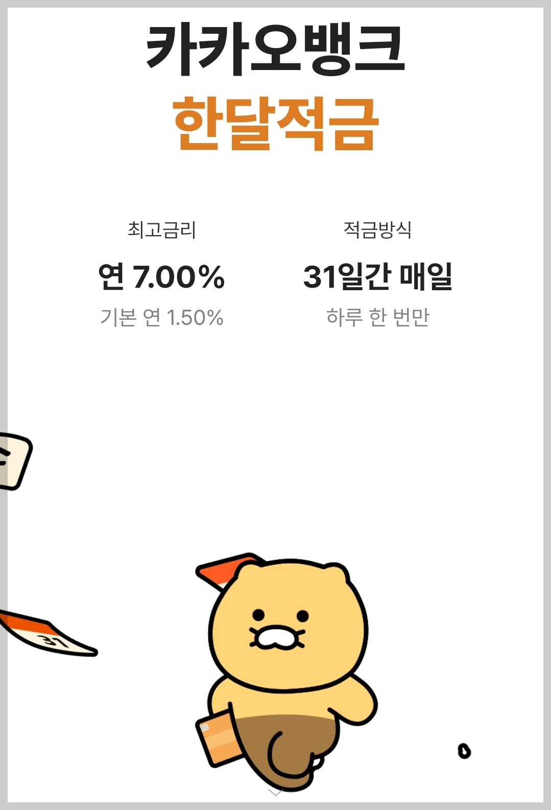 안녕하세요. 티끌모앙입니다. 오늘은 요즘같은 저금리 시대에 단비와 같은 고금리적금  하나 가지고 왔는데요. #카카오뱅크 #한달적금에 대해 알아보려고 합니다. 사실 단비라고 소개하며 고금리적금이라고 말했지만, 솔직히 이 적금 상품은 아쉬는 부분이 좀 있어요. 이름처럼 #한달적금 인데요. 한달동안 꾸준히 입금하면 최대 연7%이자를 주는 단기적금상품입니다. 그럼 지금부터 #카카오뱅크한달적금 좀 더 자세하게 알아가보도록 하겠습니다.