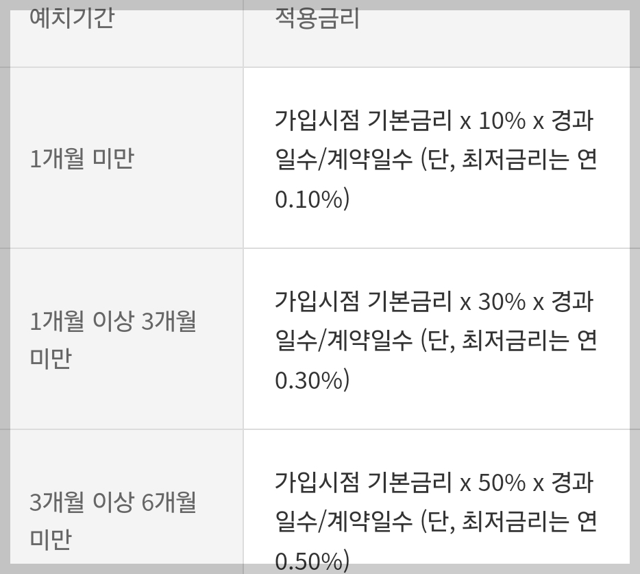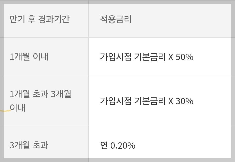 - 만기 후 경과기간 구간별로 만기 후 금리는 차등 적용됩니다.