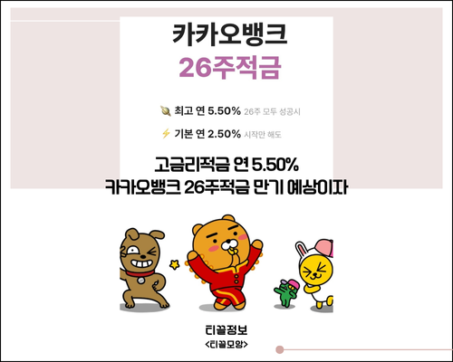 안녕하세요. 티끌모앙입니다. 오늘 가져온 티끌정보는 연 5.50% 이자를 주는 카카오뱅크 26주적금 상품을 가져와봤어요. 그런데 아쉬운점은 예전에 26주적금 신청했을때에는 7% 금리를 챙겨줬던거 같은데 5.50%로 떨어졌더라고요. 물론 7% 금리를 줬을 때도 적금할 수 있는 금액이 작아서 이자금액 자체도 작은 상품이였는데 5.50%로 떨어졌다고 하니 더욱 작고 소중해지더라고요. 물론 카카오뱅크나 토스 같은 경우 이자를 바라고 돈을 넣는 상품은 아닌지라 아무래도 이자를 많이 받으려면 지역단위 농협이나 수협같은 곳의 상품을 알아보고 가입하는 것이 좋은것 같습니다. 그래도 티끌모아 태산이라고 하잖아요. 풍차돌리기를 잘만 이용하면 괜찮은 상품이라 생각합니다. 그럼 지금부터 본격적으로 소개해드리도록 할께요.