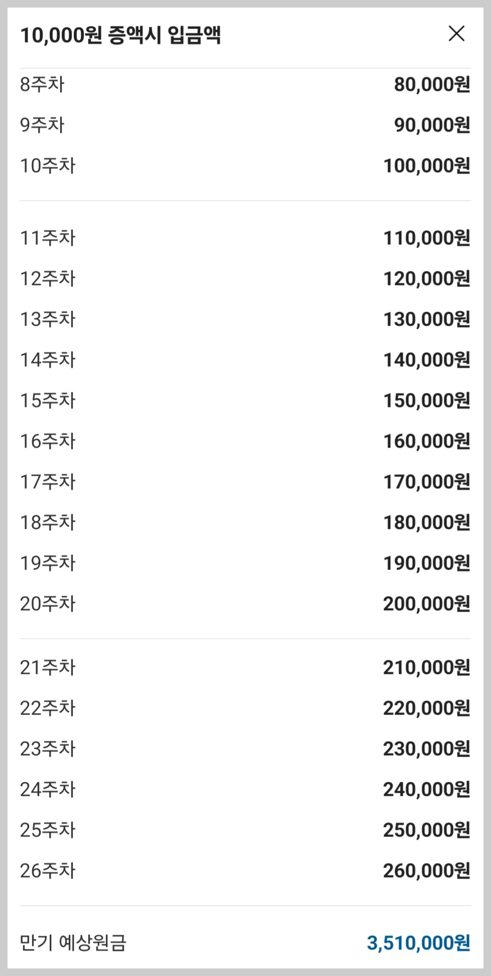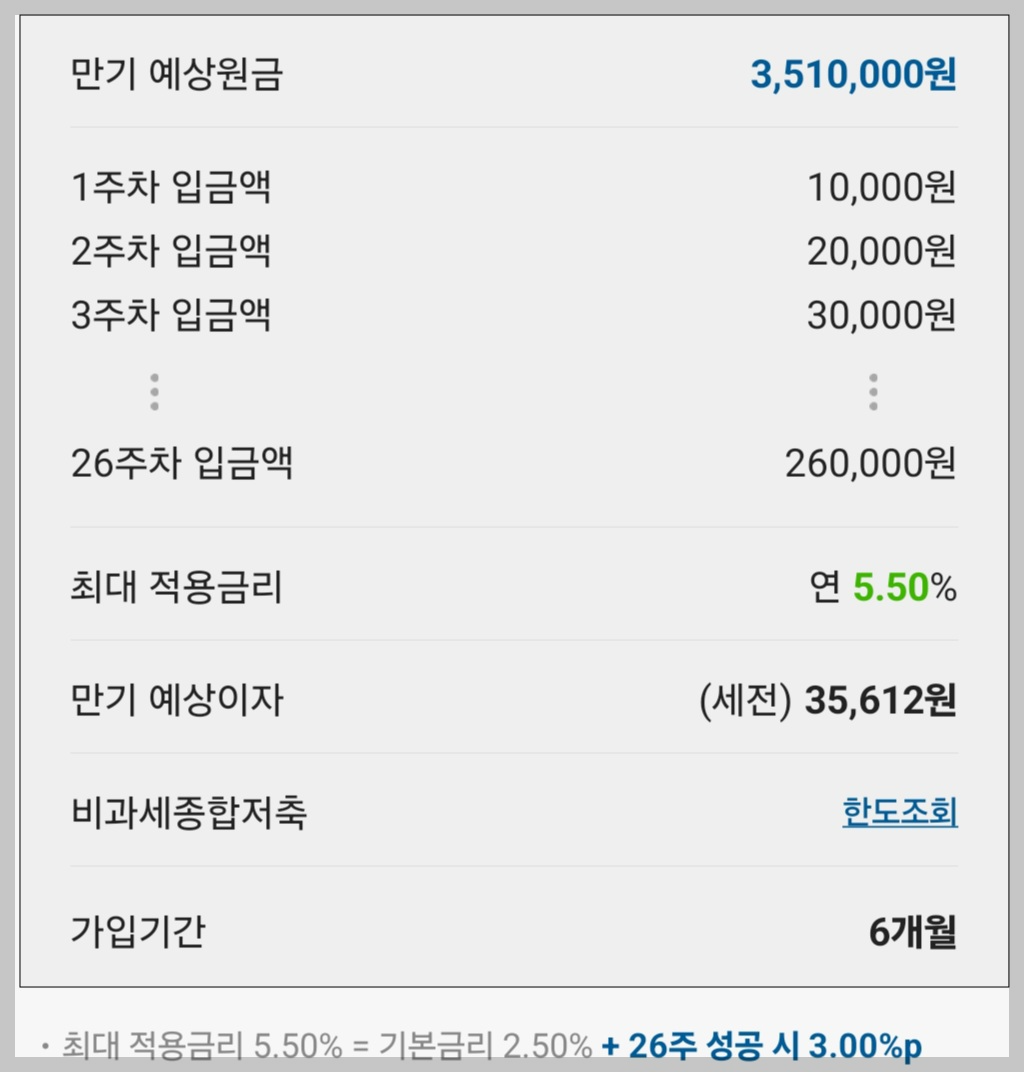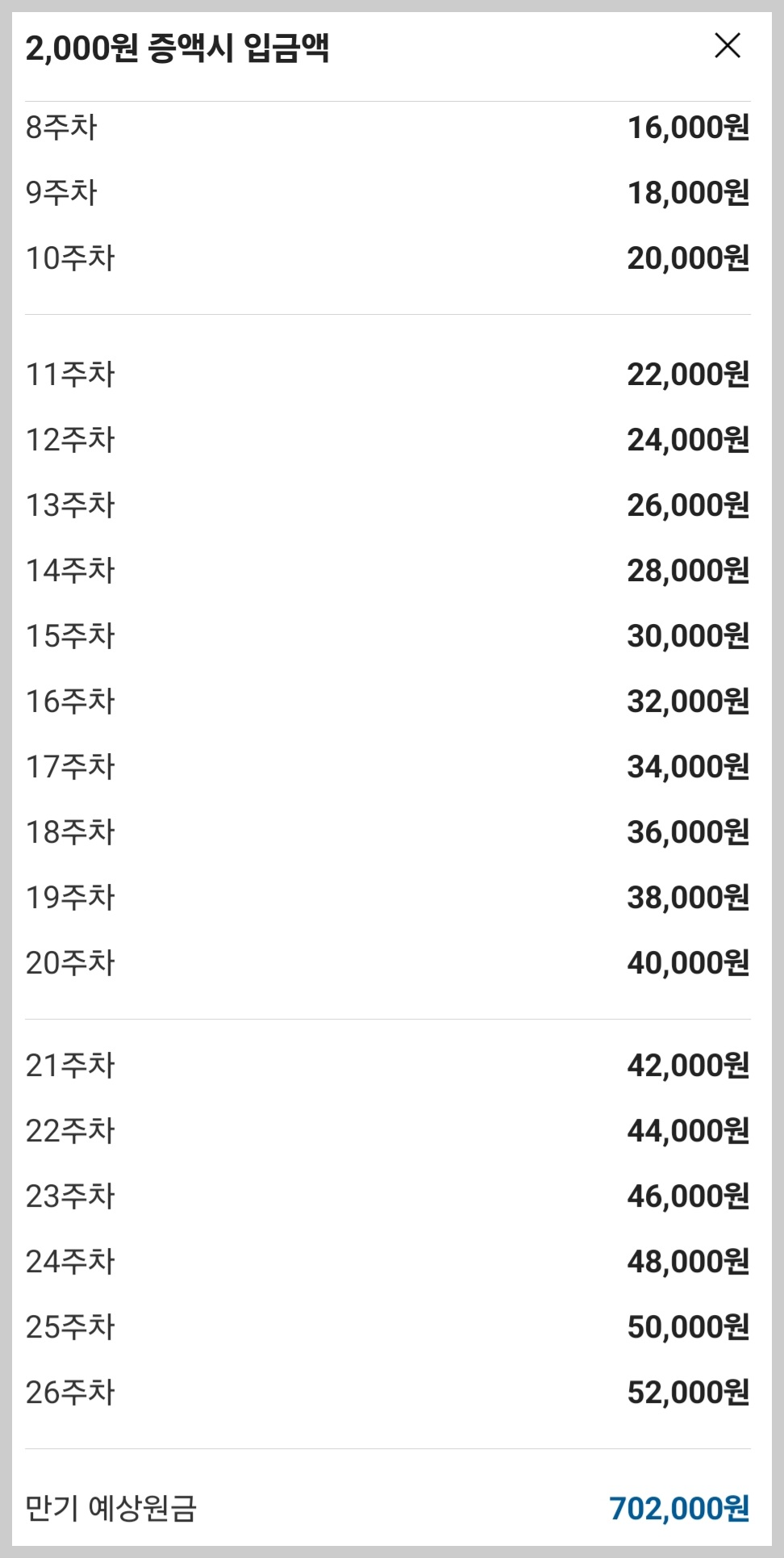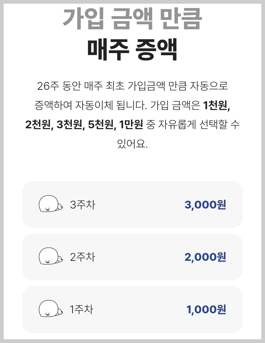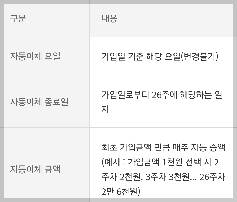 - 26주 동안 매주 금액을 자동으로 증액하여 납입하는 자동이체 서비스