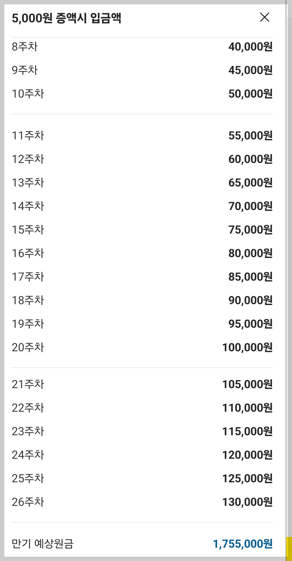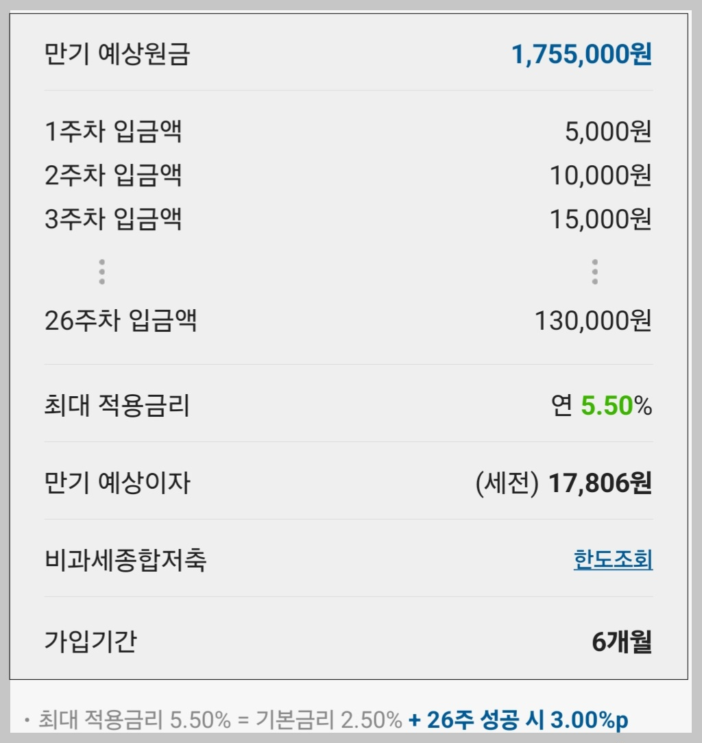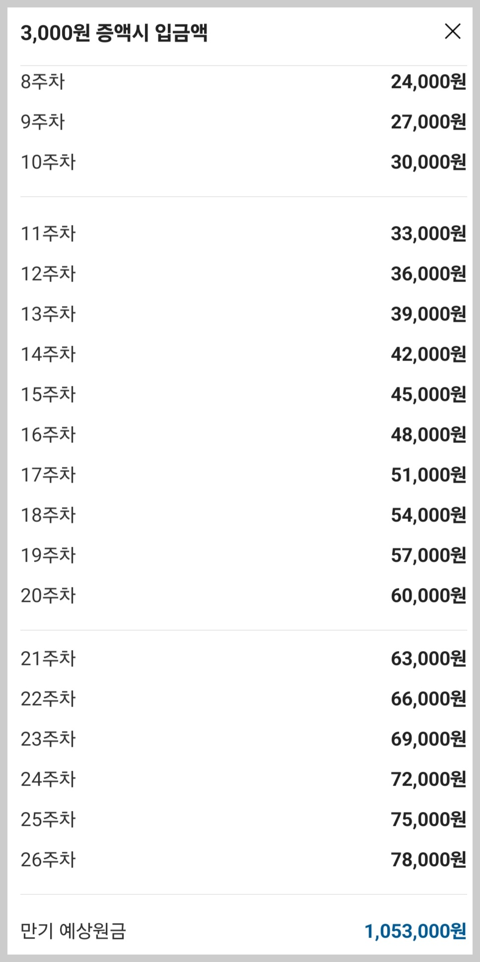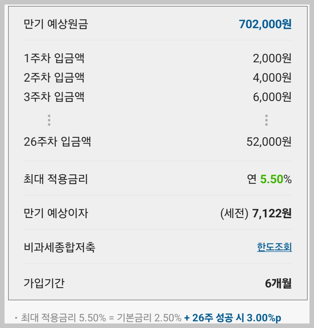 - 26주 동안 매주 금액을 자동으로 증액하여 납입하는 자동이체 서비스