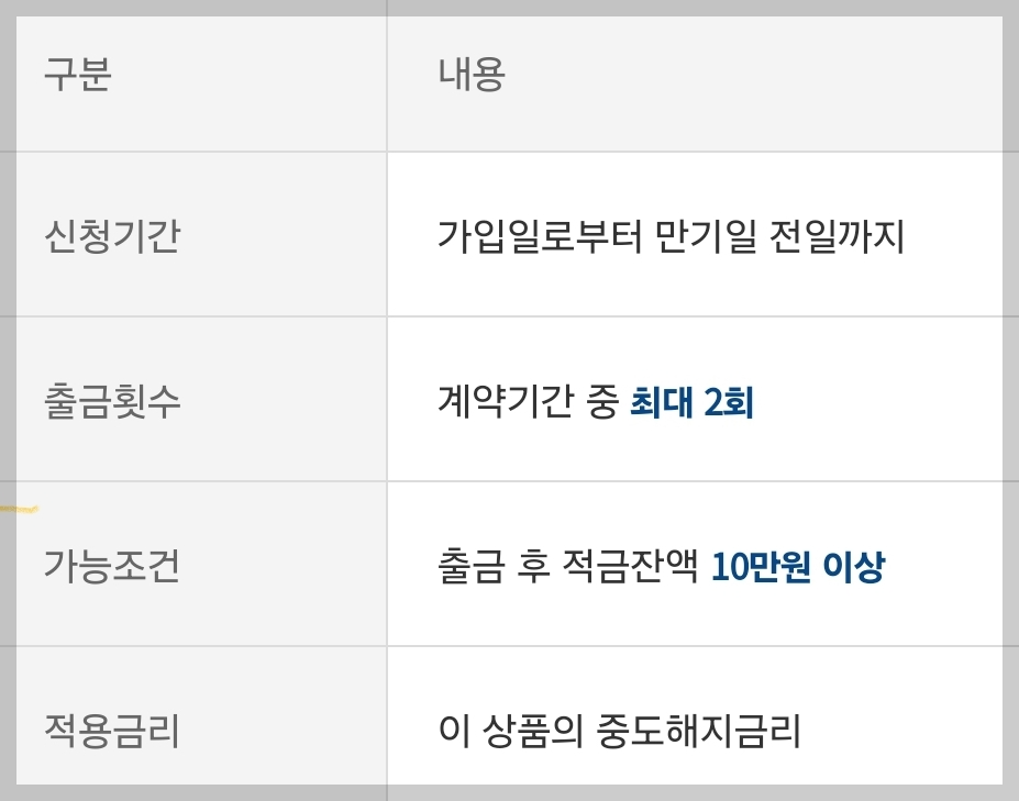 - 만기 전에 해지하지 않고 일부 금액만 출금이 가능한 기능입니다.