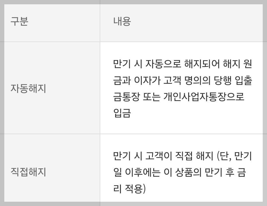 - 직접해지 : 만기 시 고객이 직접 해지하는 방식으로 주의할 점은 만기일 이후에는 이 상품의 만기 후 금리가 적용 됩니다. 이점 꼭 유의하시기 바랍니다.