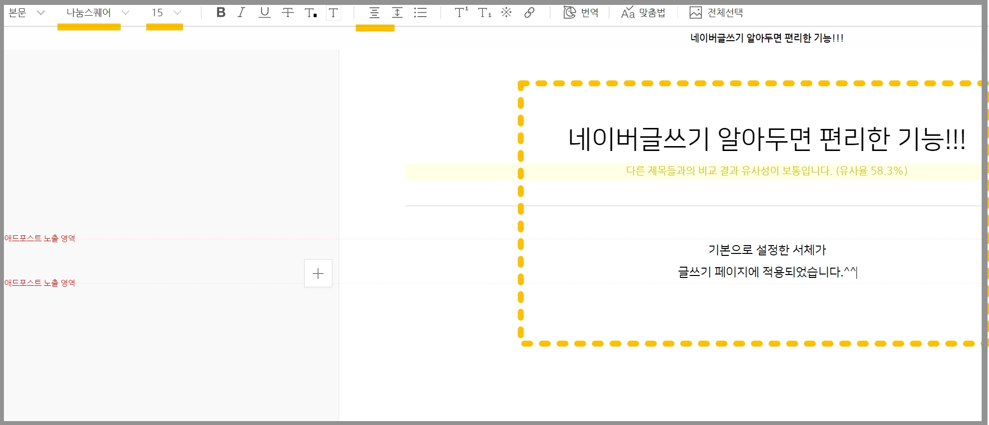 짜잔!!! 바로 글쓰기 페이지로 넘어갔는데 제가 설정했던 글씨체와 정렬 글씨사이즈가 적용이 자동적으로 되어 있는 것을 볼 수 있습니다. 한번 이렇게 설정해 주시면 블로그 글쓰실 때마다 고치지 않아도 되니 편하고 좋더라고요. 울 꾸독님들 잘 따라오셨을까요? 어렵지 않으셨죠? 도움이 되셨으면 좋겠어요.^^