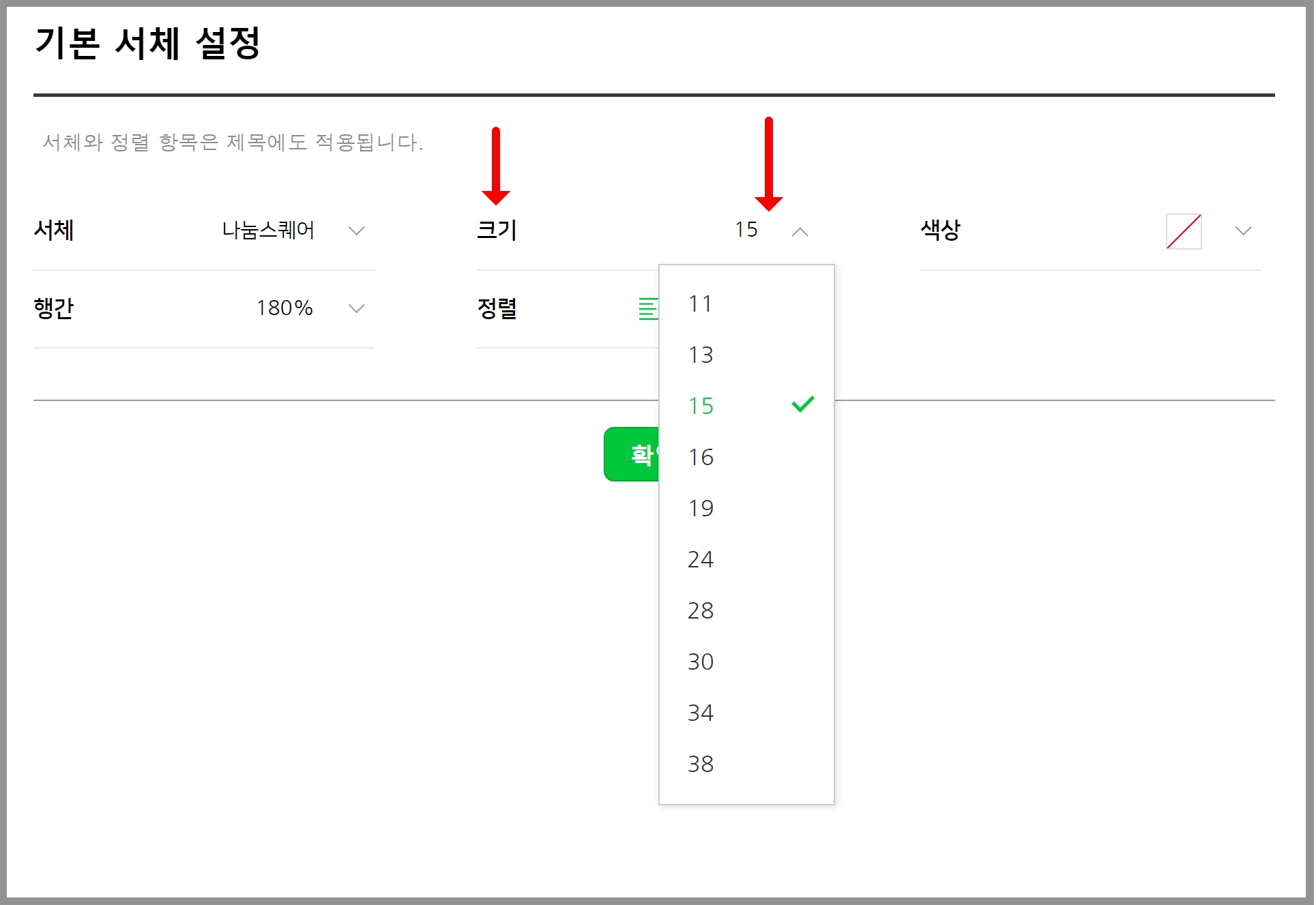 다음은 크기설정입니다. 크기는 11/13/15/16/19/24/28/30/34/38 10개의 크기가 있어요. 처음 블로그 글쓰기페이지에 글을 쓰는데 본문 글씨가 너무 큰거예요. 제가 본문 글 사이즈를 19부터 13까지 써보고 올려봤는데요. 제 개인적인 생각으로는 본문글 사이즈는 [15] 사이즈가 적당하고 이쁘고 가독성이 있어보여요. 순전히 제 개인적인 생각입니다.(방긋^^) 16으로도 해봤는데 업로드 했을 때 본문 글씨가 크다보니 전체적인 느낌이 글씨만 보이는 느낌!! 집중이 되지 않았어요. 꾸독님들도 일단 하나하나 적용시켜보시고 정하시면 좋으실것같습니다. 저는 그래서 저는 글씨크기는 [15]로 적용시켰어요.