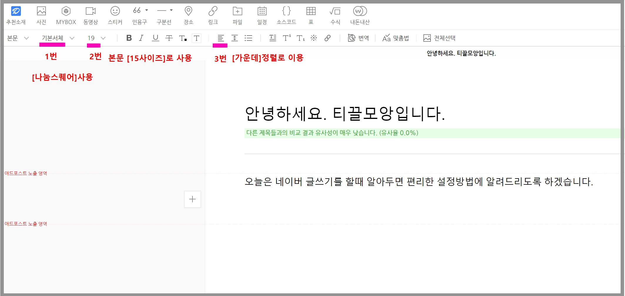 짜잔!!! 바로 글쓰기 페이지로 넘어갔는데 제가 설정했던 글씨체와 정렬 글씨사이즈가 적용이 자동적으로 되어 있는 것을 볼 수 있습니다. 한번 이렇게 설정해 주시면 블로그 글쓰실 때마다 고치지 않아도 되니 편하고 좋더라고요. 울 꾸독님들 잘 따라오셨을까요? 어렵지 않으셨죠? 도움이 되셨으면 좋겠어요.^^