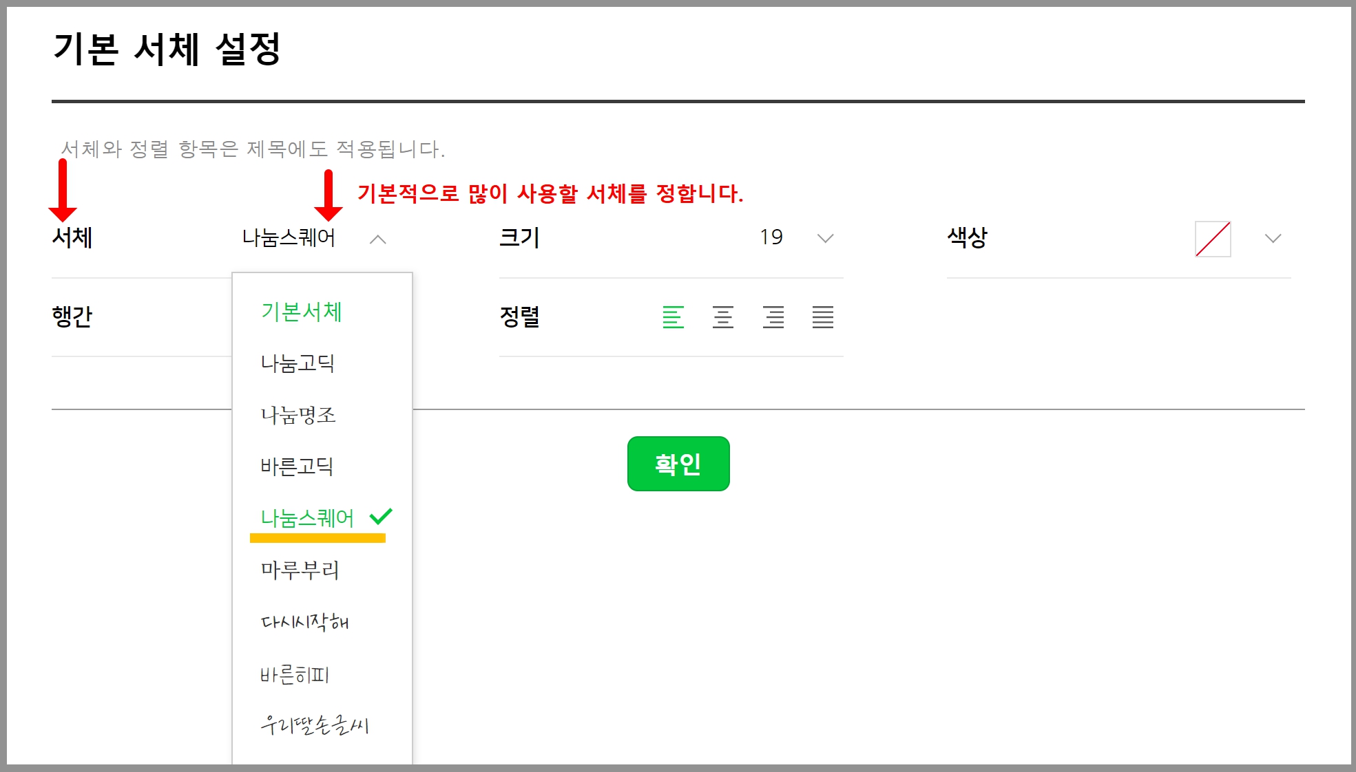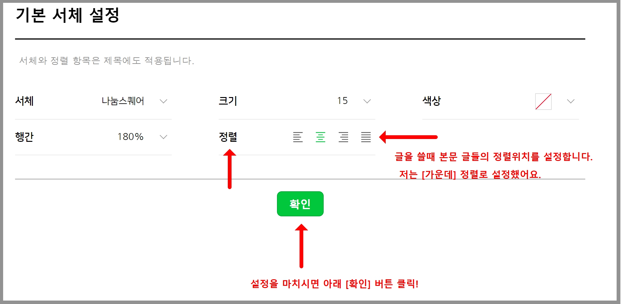 다음로 글정렬인데요. 보통 외쪽정렬과 가운데 정렬을 많이 사용하시고 가끔 블로그 보면 일자정렬도 보이더라고요. 그런데 대부분 네이버같은 경우 가운데정렬을 많이 선호해요. 저 같은 경우도 티스토리는 왼쪽 정렬도 쓰지만 네이버블로그 같은 경우 가운데로 설정해 두고 쓴답니다. 모두 선택하셨다면, 하단에 [확인] 버튼 클릭해 주시면 설정한 기본서체가 적용됩니다.