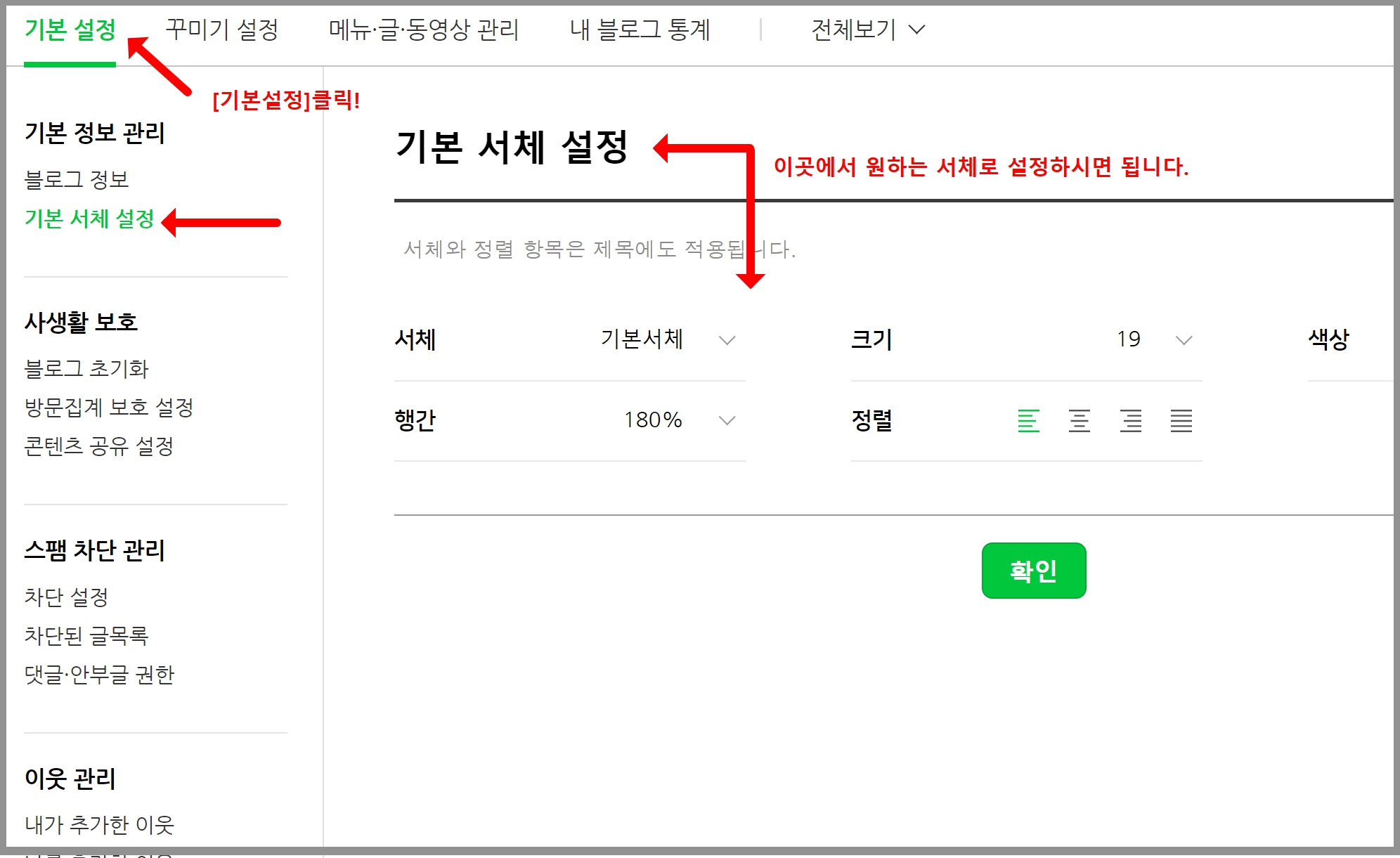 그러면 내블로그를 꾸미고 관리할 수 있는 페이지로 넘어갑니다. 상단 좌측 카테고리 보시면 [기본설정] 보이시죠? 클릭해 주시고, 왼쪽사이드바 카테고리에 [기본 정보 관리] ▷ [기본 서체 설정] 클릭하시면, [기본 서체 설정] 페이지가 보이실거예요. 이 공간에서 내가 원하는 서체 / 글씨크기 / 글정렬 등 적용시켜주시면 됩니다.