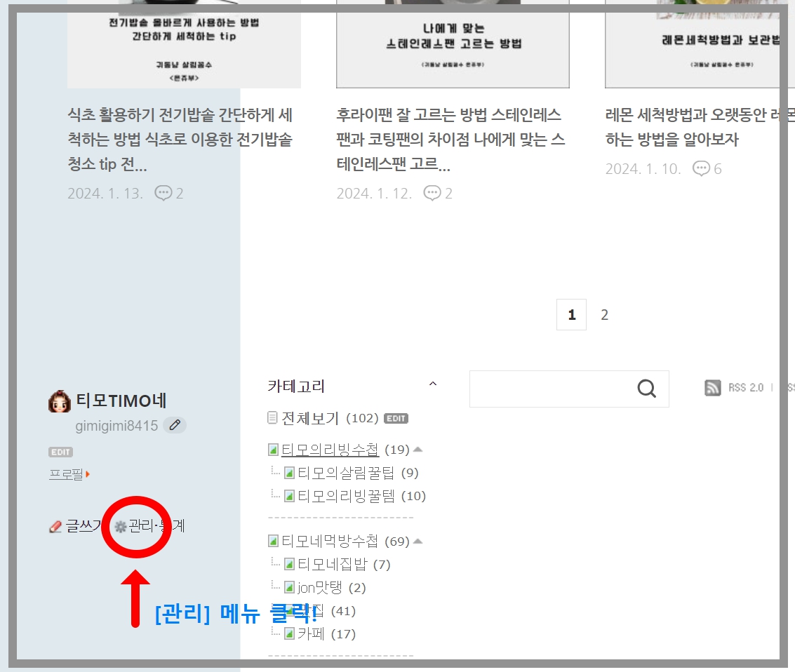 - 내가 정한 내 블로그 카테고리들 중 [상단메뉴]에 배치되었으면 하는 카테고리를 클릭합니다. 제가 처음 정한 카테고리는 "티모의리빙수첩" 카테고리를 선택했습니다.