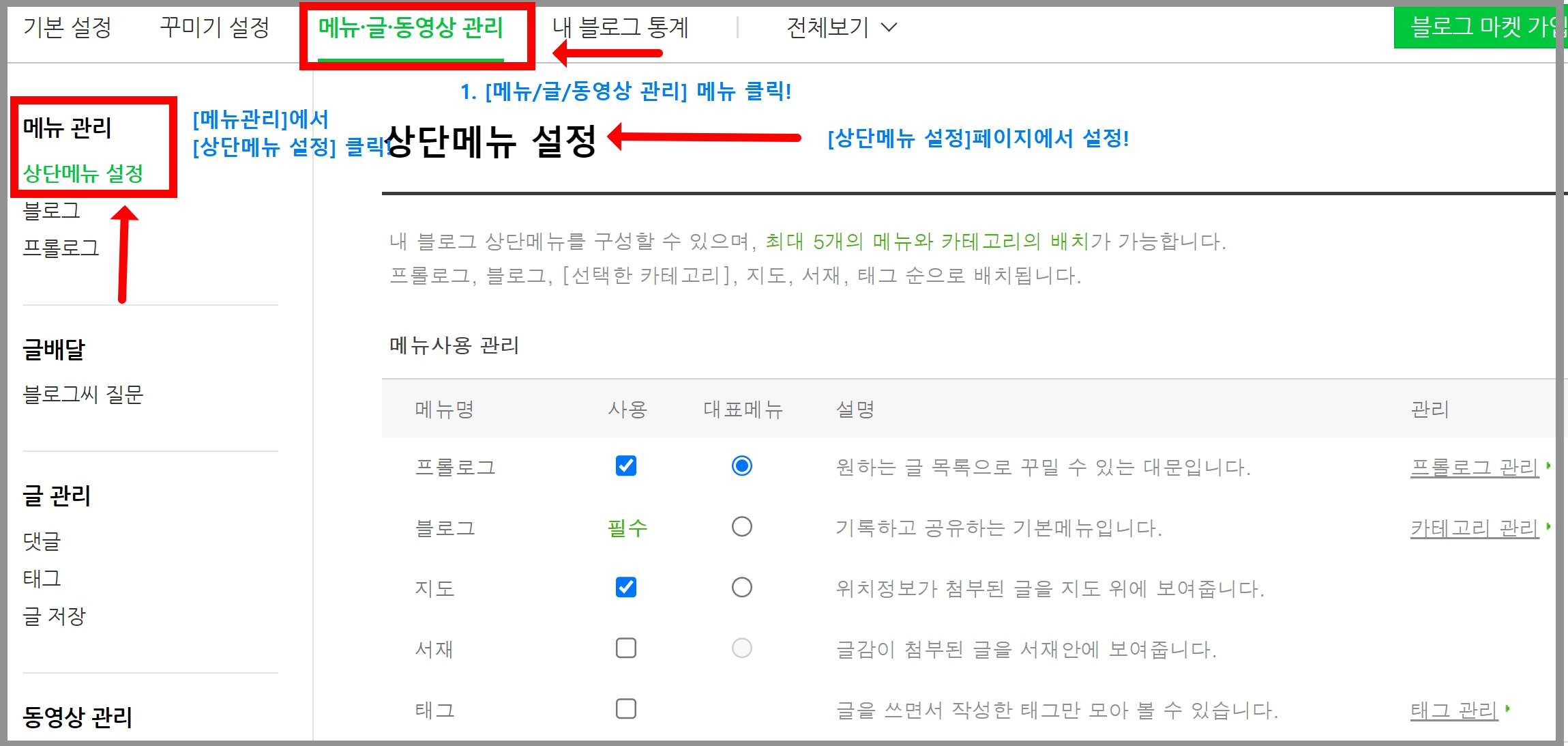 ◎ 상단메뉴 설정하는 방법 알아보기!