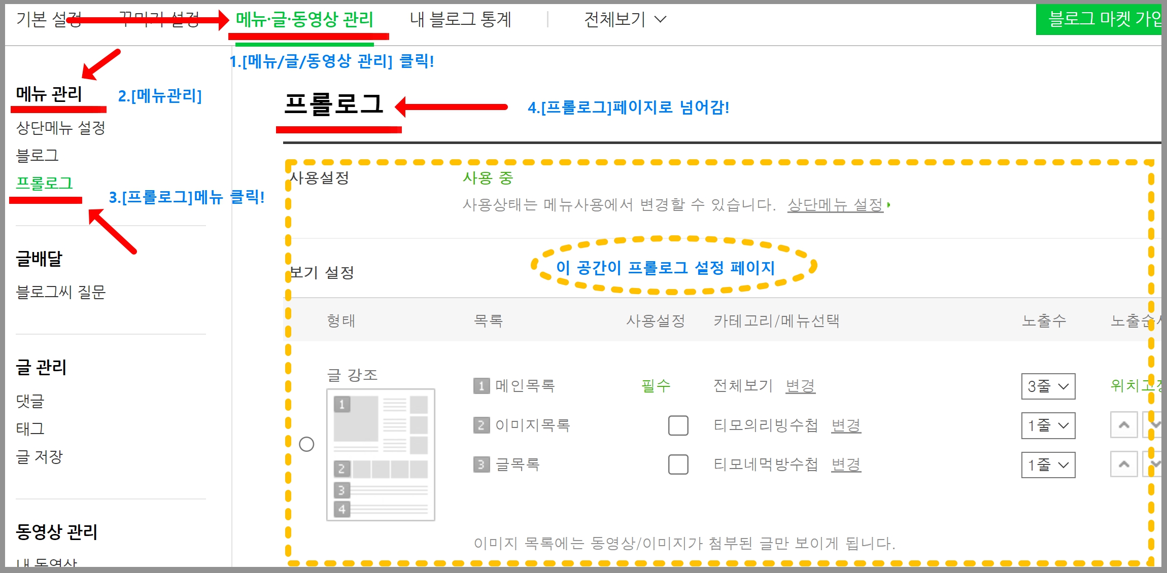 - 3줄로 설정한 [①메인목록]는 세로로 내가 쓴 포스팅이 3줄로 보여집니다.