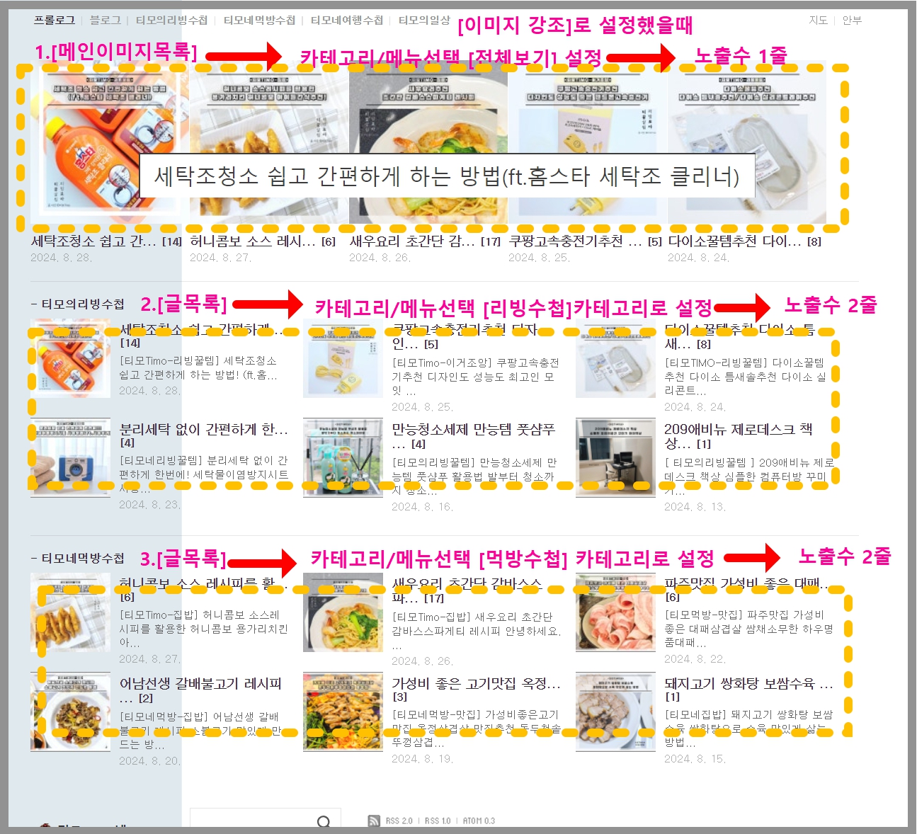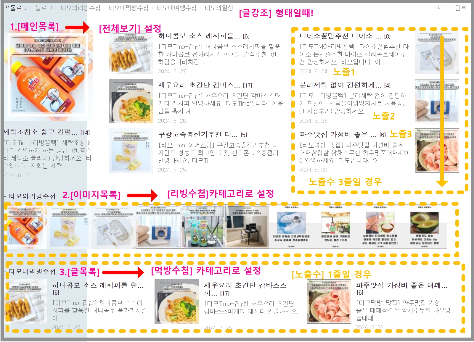 - 저같은 경우 ①메인목록 → [전체보기]로 설정하였으며, ②이미지목록 → [리빙수첩]이라는 카테고리로 설정, ③글목록 → [먹방수첩]이라는 카테고리로 설정하였습니다.