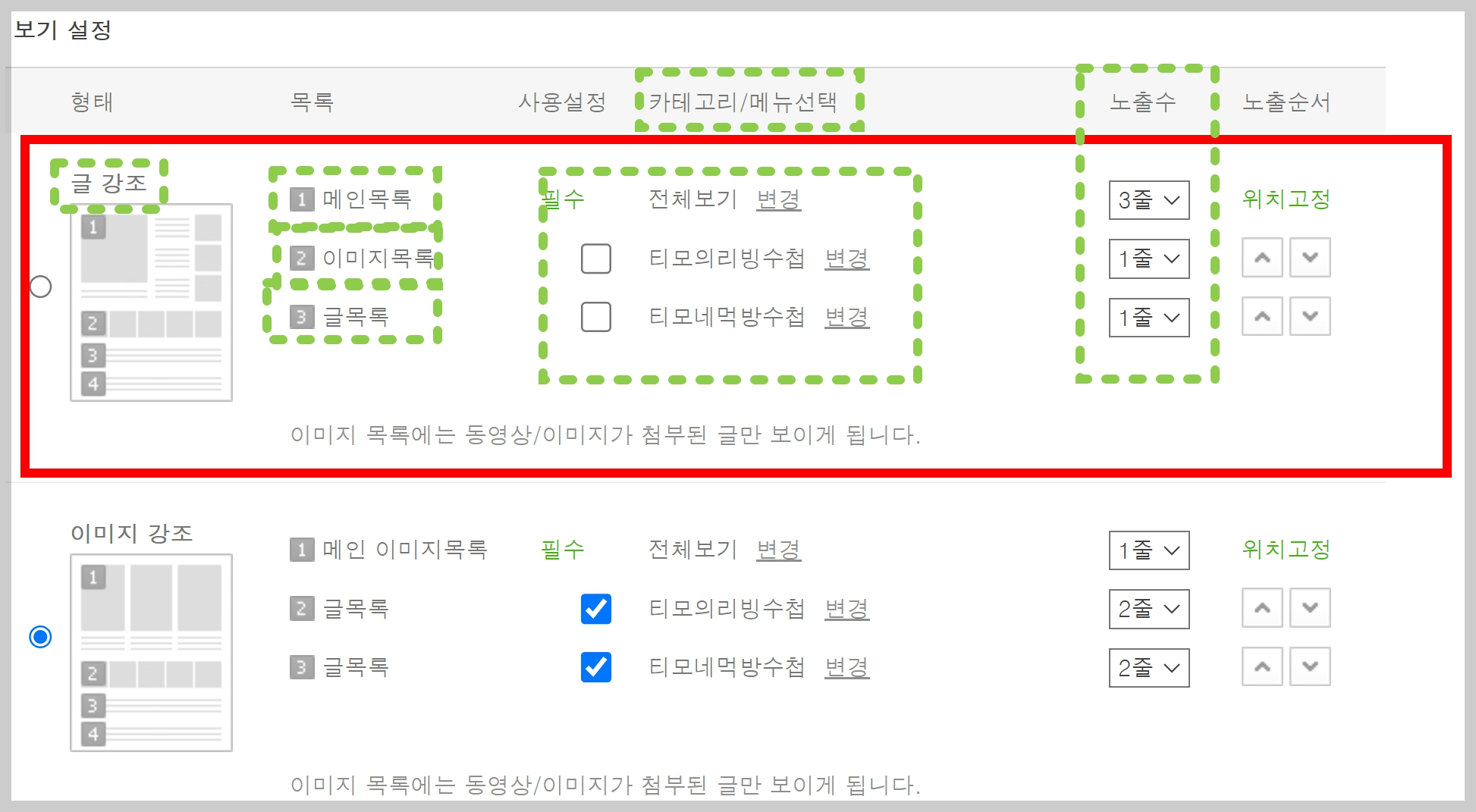 - 1줄로 설전한 [②글목록]과 [③글목록]의 설정모습은 세로로 2줄씩 포스팅이 보여지고 있습니다.