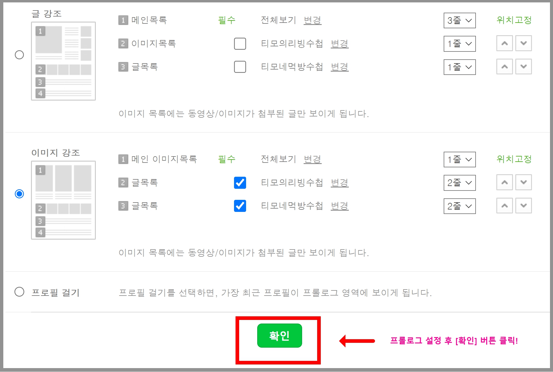 프롤로그 강조형식으로는 글 목록을 위주로 보여주는 [글 강조형]과 이미지 중심으로 노출이 되는 [이미지 강조형] 등의 2가지 형태가 있습니다. 이 중 나에게 맞는 형식으로 선택해 주시면 됩니다.