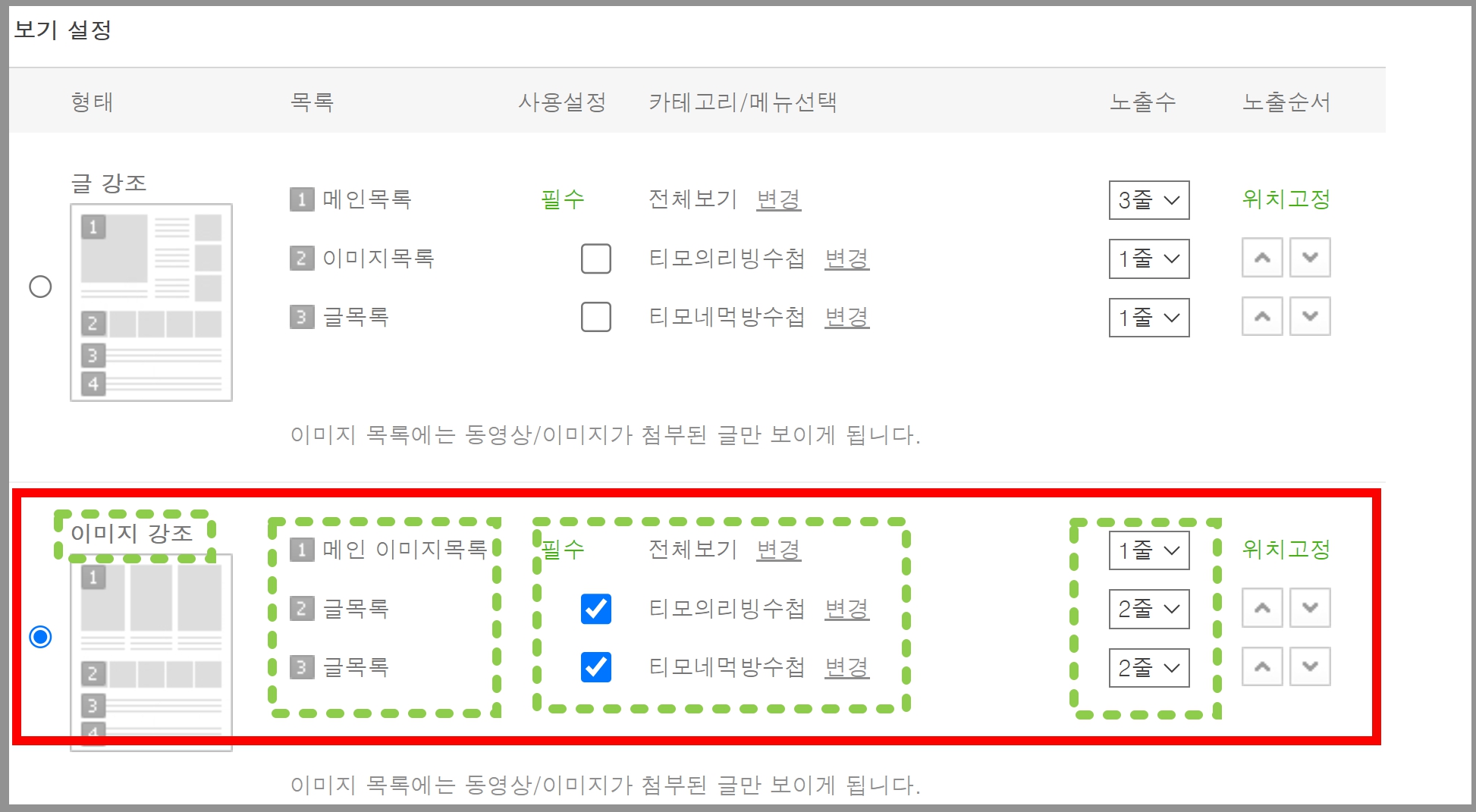 - 1줄로 설전한 [②이미지목록]과 [③글목록]의 설정모습은 세로로 1줄씩 포스팅이 보여지고 있습니다.
