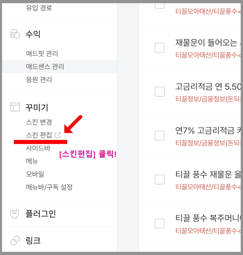 - 사이드 카테고리들 중 [꾸미기]에서 [스킨편집] 클릭!