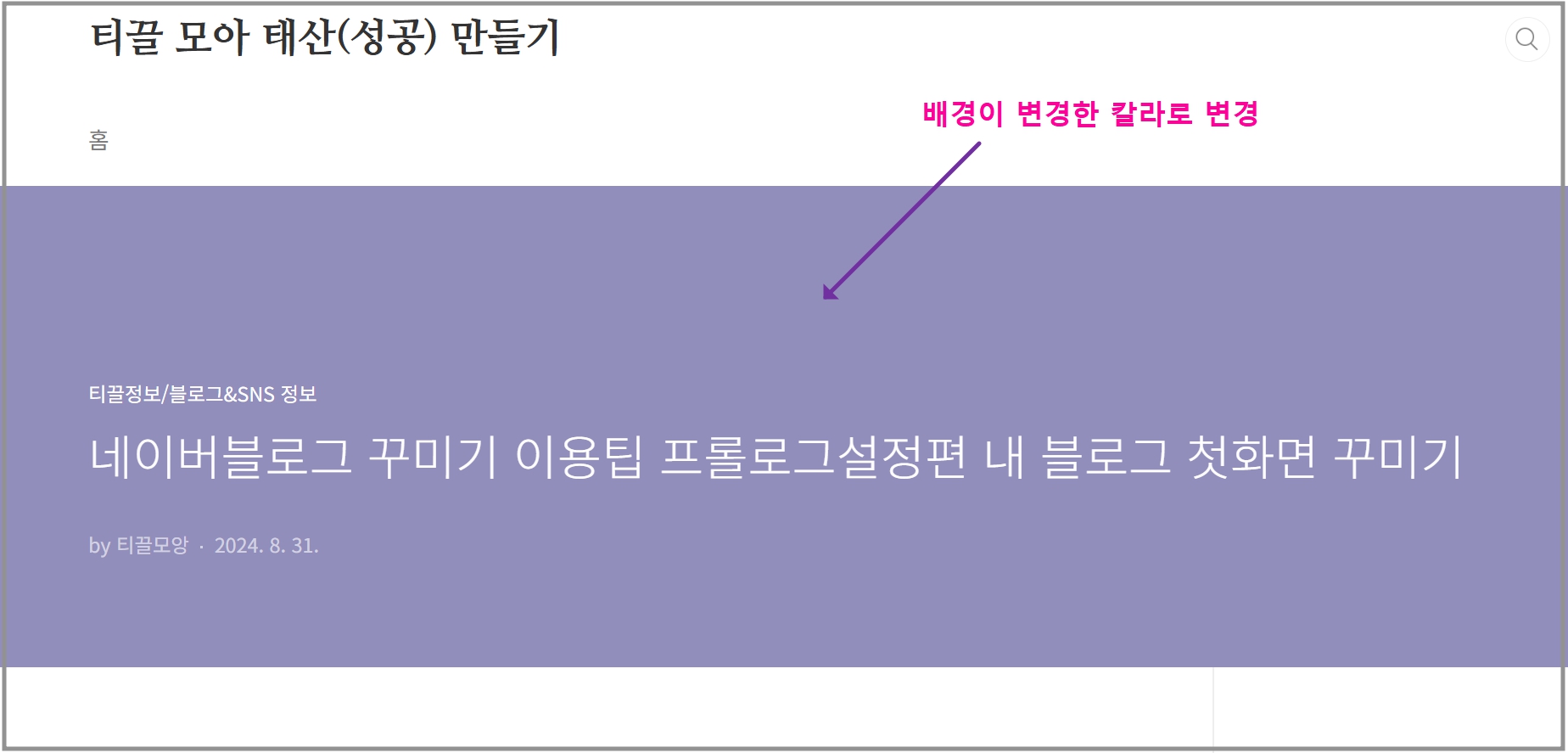 짜잔!!! 전에 사이즈도 맞지 않는 대표이미지 사진이 보였다면 변경 후 제가 골라던 연보라 색상의 단색으로 배경이 바뀌었습니다. 확실히 제목글씨도 선명히 잘 보이며, 훨씬 깔끔하고 보기도 편해 가독성이 좋아졌네요.