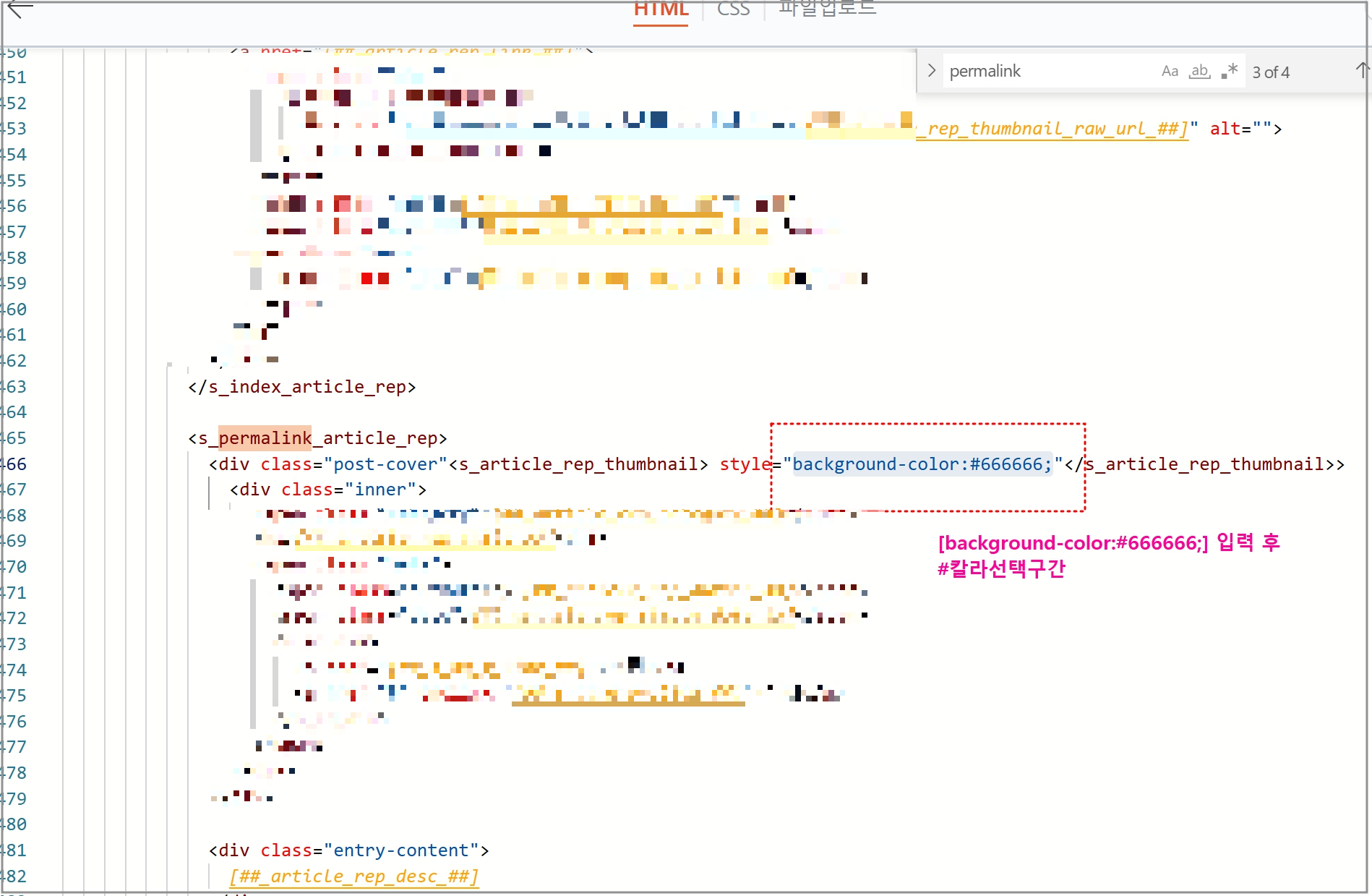 - [검색창] 에 [permalink] 를 입력하면 [html]화면에 [permalink] 단어가 들어간 문장들이 색깔표시체크가 되어 검색됩니다. (위에 사진참고)