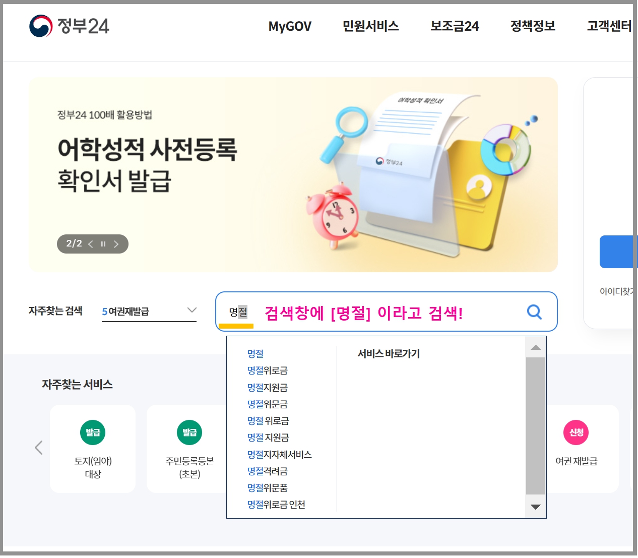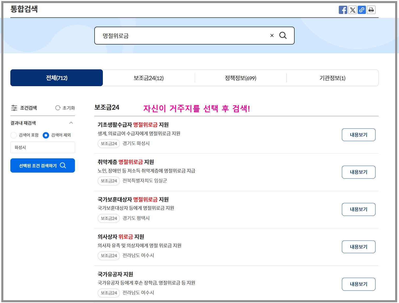 - 메인페이지 검색창에 [명절]이라고 검색하신 후 자신의 거주지를 선택!