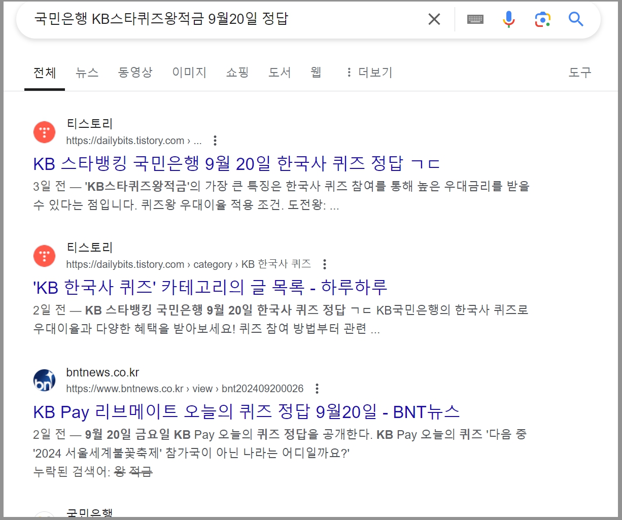 - 검색창에 <국민은행 KB스타퀴즈왕적금 정답> 또는 < 국민은행 KB스타퀴즈왕적금 0월0일 정답> 입력 후 검샏