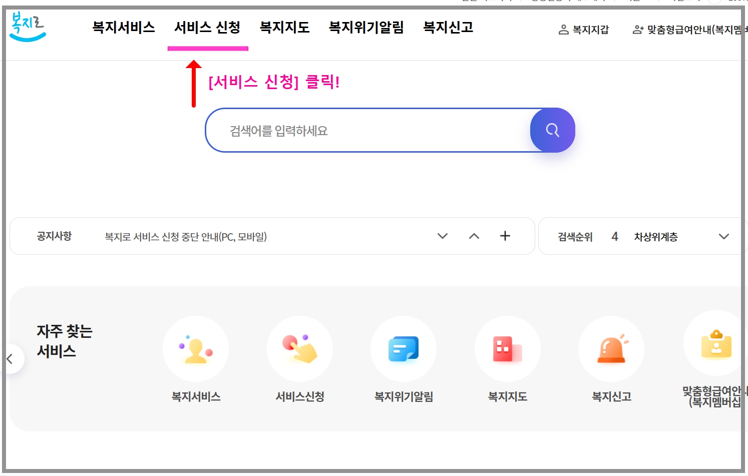 - [복지서비스 신청] 눌러주시기 바랍니다.
