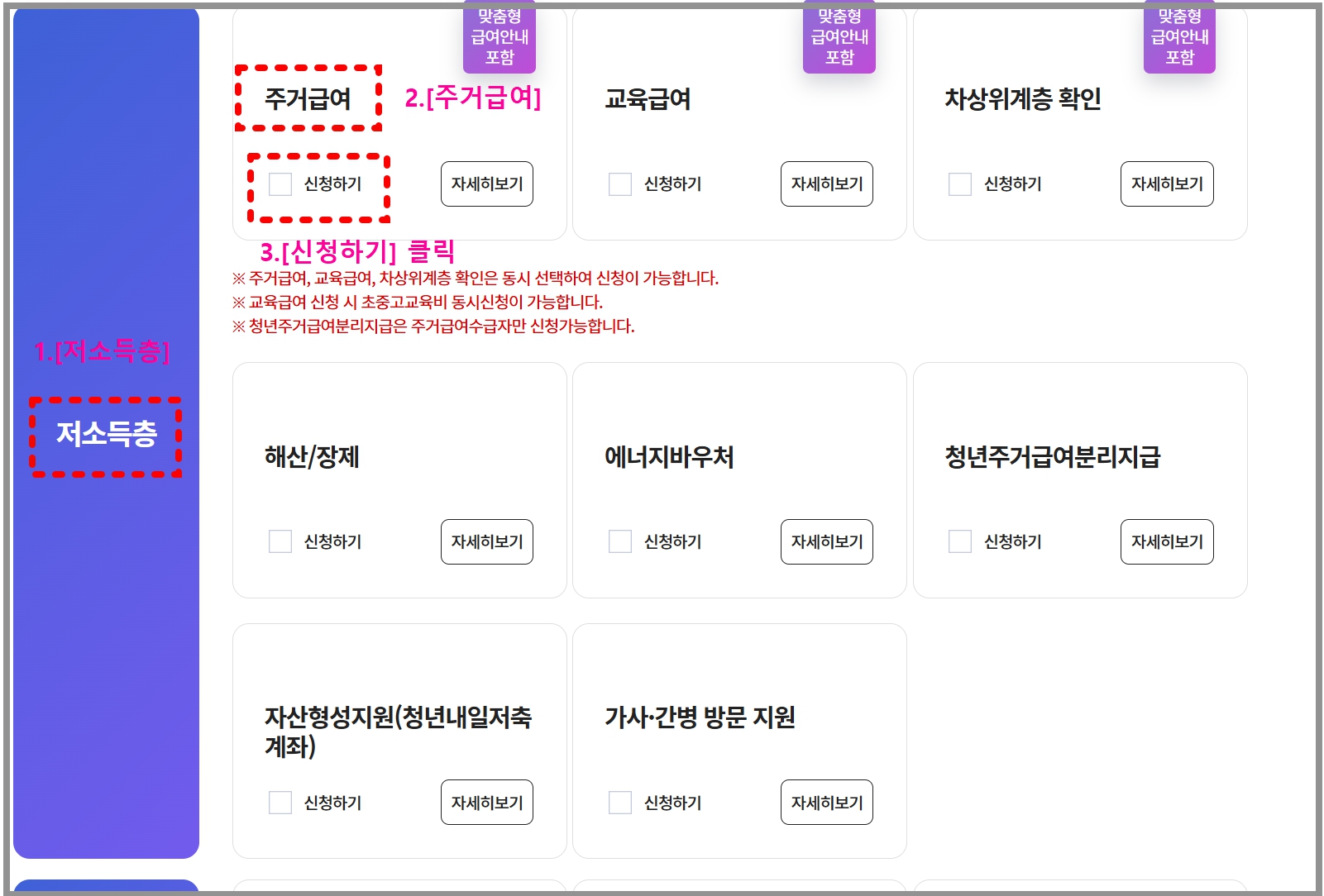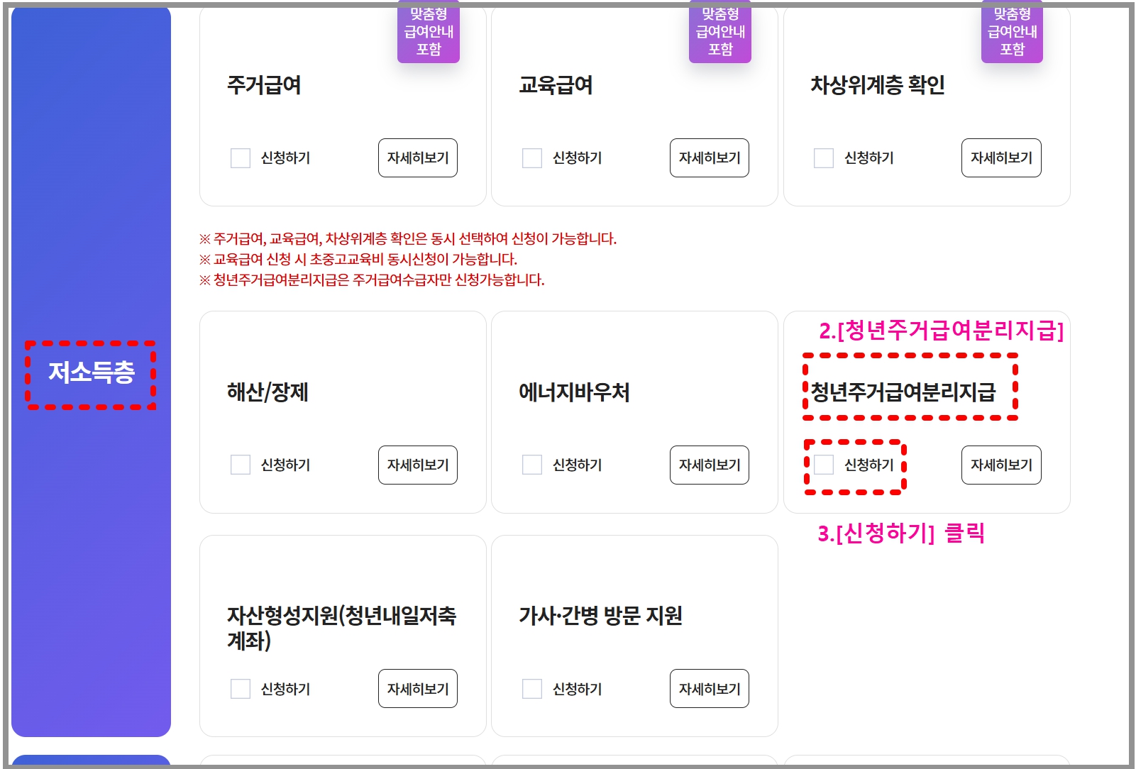- 복지로 온라인신청 경로 : 복지로 로그인>서비스 신청>복지서비스 신청>복지급여 신청>저소득층>'주거급여' 또는 '청년주거급여분리지급'