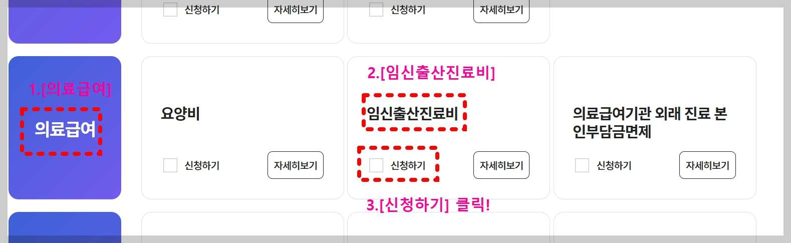 - 복지로 로그인>서비스 신청>복지서비스 신청>복지급여 신청>의료급여>임신출산진료비