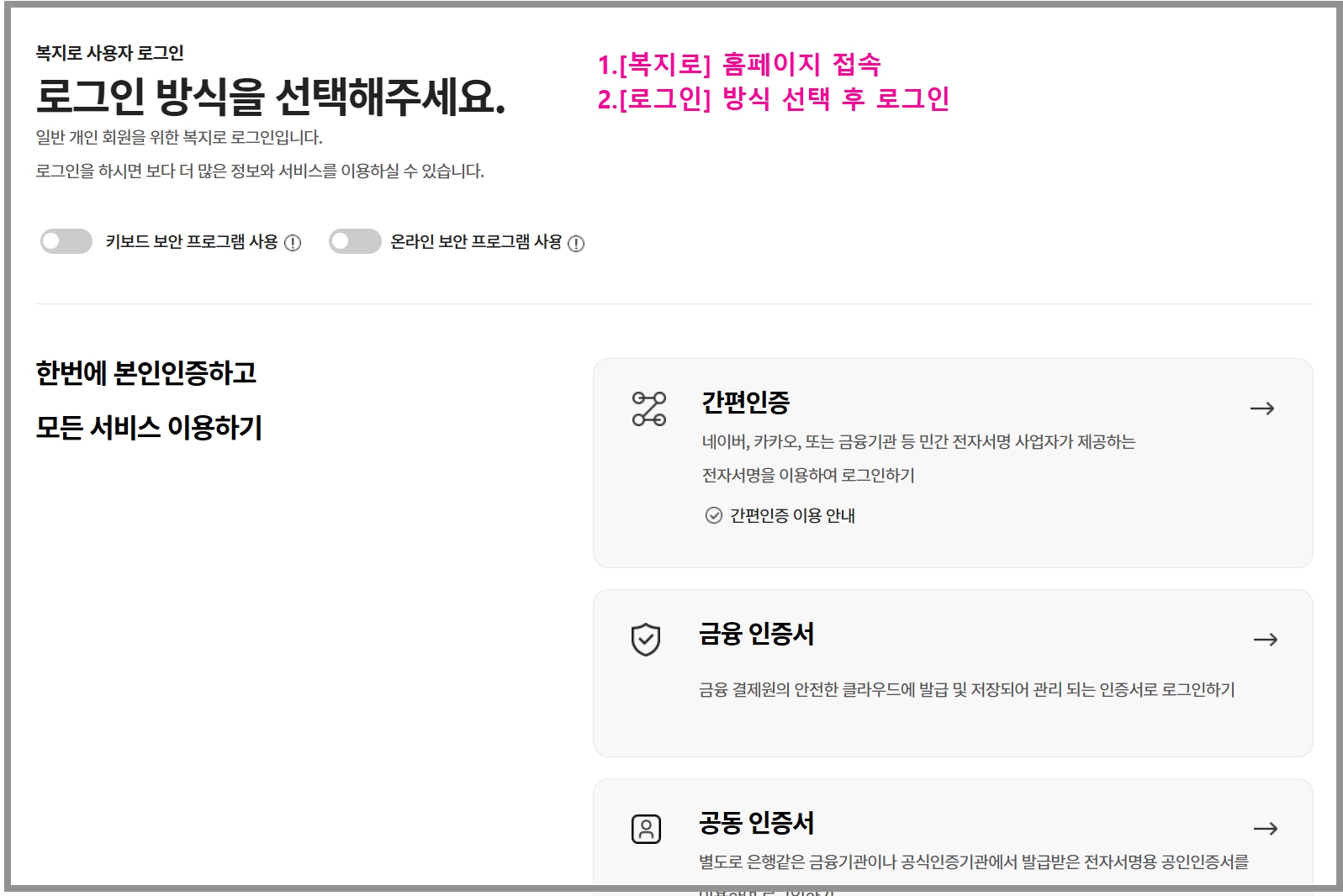 △ 복지로 편하신 방식으로 [로그인] 해주시기 바랍니다.