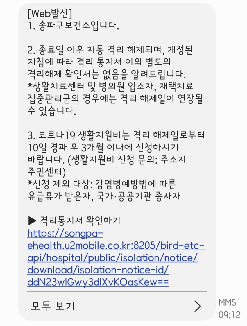 저같은 경우는 문자메세지로 격리해제 통지서를 받았습니다.