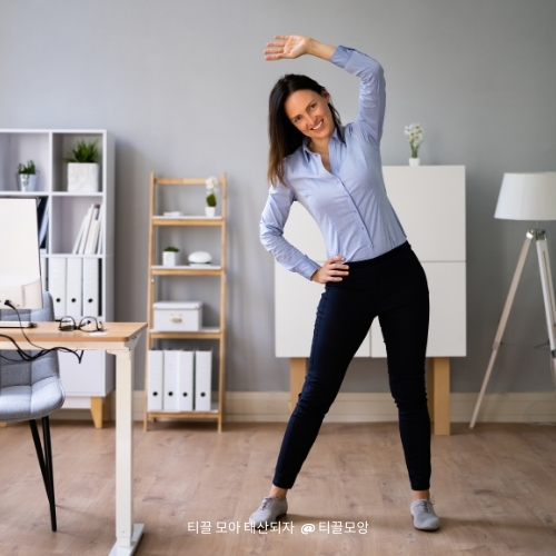 - 자리에 앉아 있더라도 다리 스트레칭이나 목 돌리기 운동을 하면 근육 긴장을 줄 일 수 있습니다.