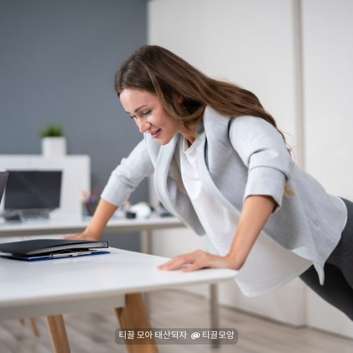 낮은 테이블에 손을 짚고, 팔굽혀펴기를 가볍게 해주는 동작으로 이 동작은 가슴과 팔 코어를 자극해 주어 근력을 강화시켜줍니다.