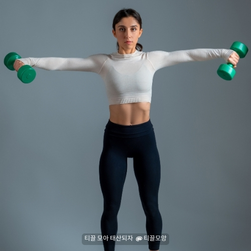 팔을 옆으로 들어 어깨 높이까지 올려줍니다. 이 운동은 어깨 근육 강화와 매일 꾸준히 할 수록 팔들기가 쉬워집니다.