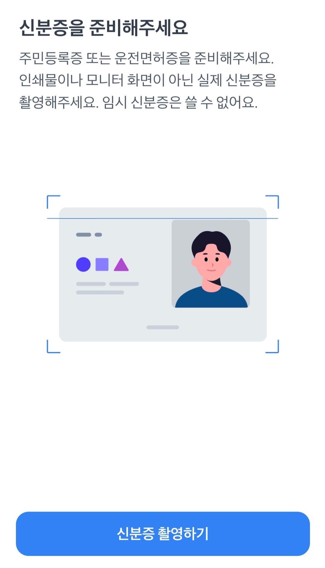 정보입력까지 빠트리지않고 모두 입력해주셨다면, 다음으로 신분증 촬영하기가 나옵니다. 화면 안에 신분증을 갖다 대시기만 하면, 자동으로 입력이 되어 어렵지 않습니다. 신분증을 바닥에 내려 두고