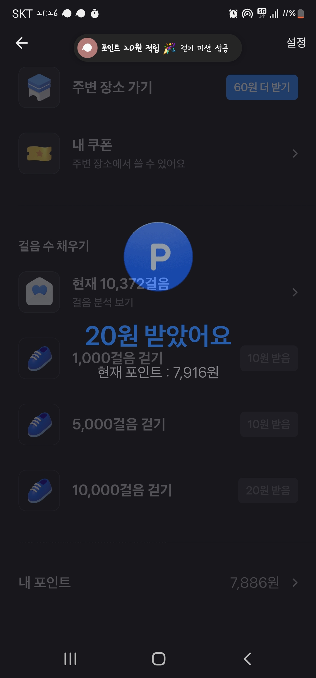 10,000보 걸으면 20원 추가지급됩니다.