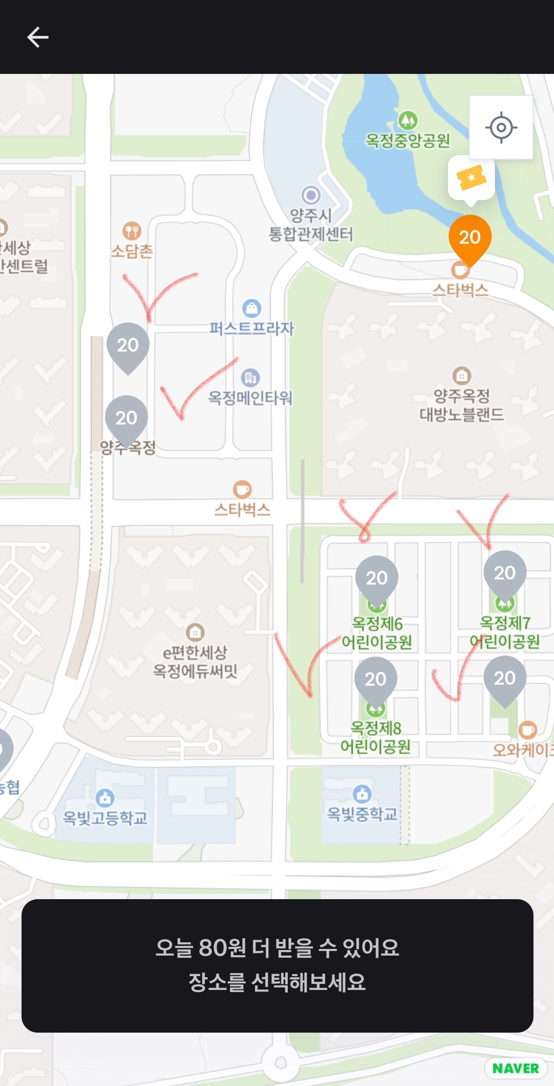 미션장소 도착하면 진동이 오면서 "20원 받으세요"