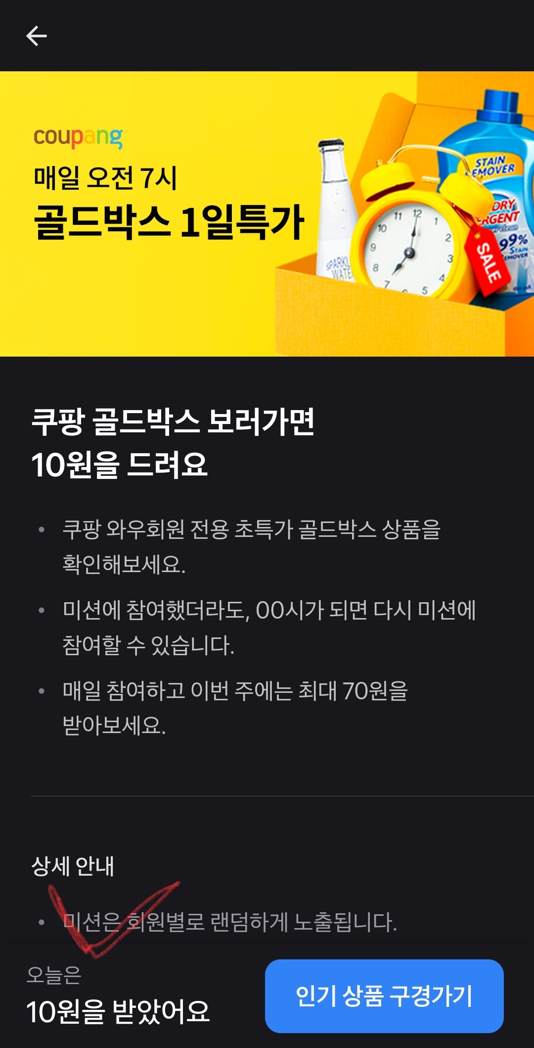 이게 매일매일 누를 수 있는데, 그냥 누르기만해도 포인트 10원이 쌓인답니다.