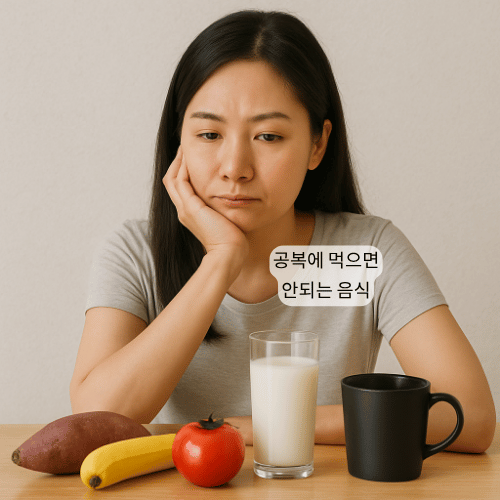 공복에는 위산 농도가 높고 위벽이 민감해져 있기 때문에 위를 자극하거나 산도가 높은 음식, 혈당을 급격히 올리는 음식, 소화가 어려운 음식 등은 피하시는 것이 건강에 좋습니다.
