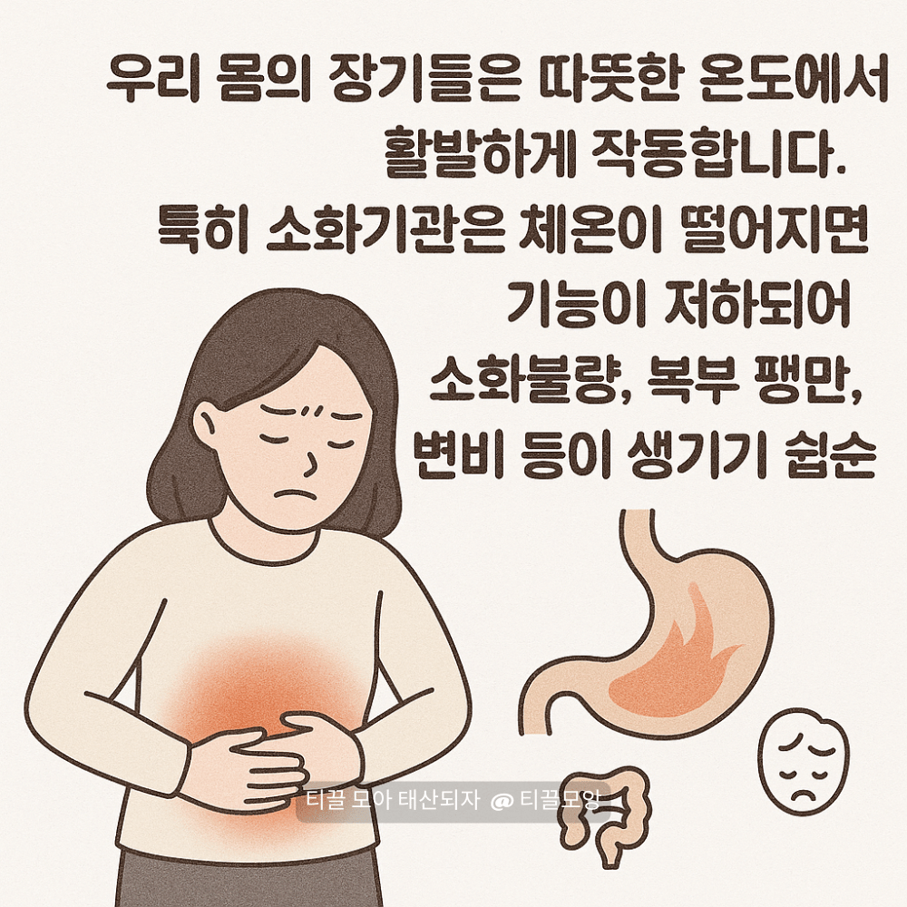 우리 몸의 장기들은 따뜻한 온도에서 활발하게 작동합니다. 특히 소화기관은 체온이 떨어지면 기능이 저하되어 소화불량, 복부 팽만, 변비 등이 생기기 쉽습니다. 몸을 따뜻하게 하면 소화 효소의 활동이 활발해지고, 신진대사가 촉진되어 체중 관리에도 도움이 됩니다.