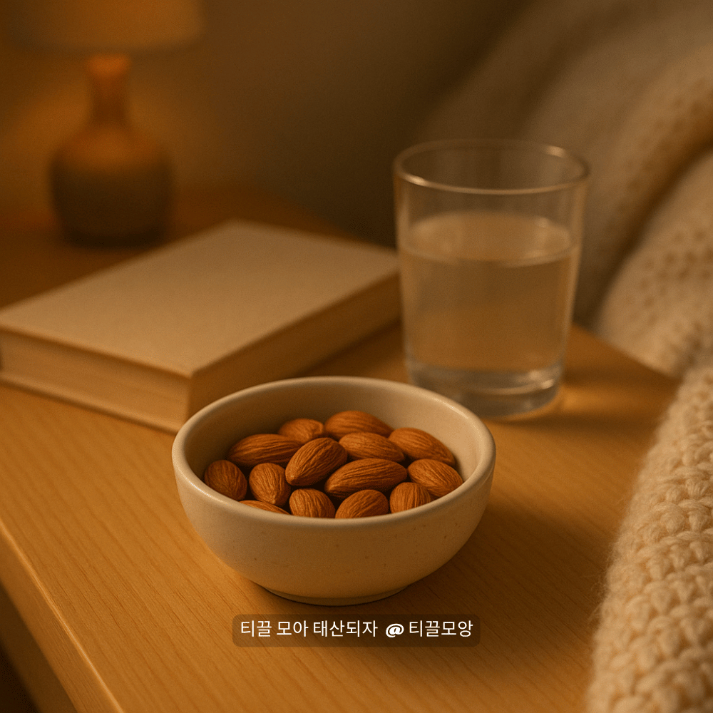 아몬드는 마그네슘, 단백질, 좋은 지방이 풍부한 견과류입니다. 마그네슘은 신경계를 안정시키고, 단백질은 혈당을 안정시켜 야간 저혈당에 의한 잠 깨는 현상을 줄여줍니다.