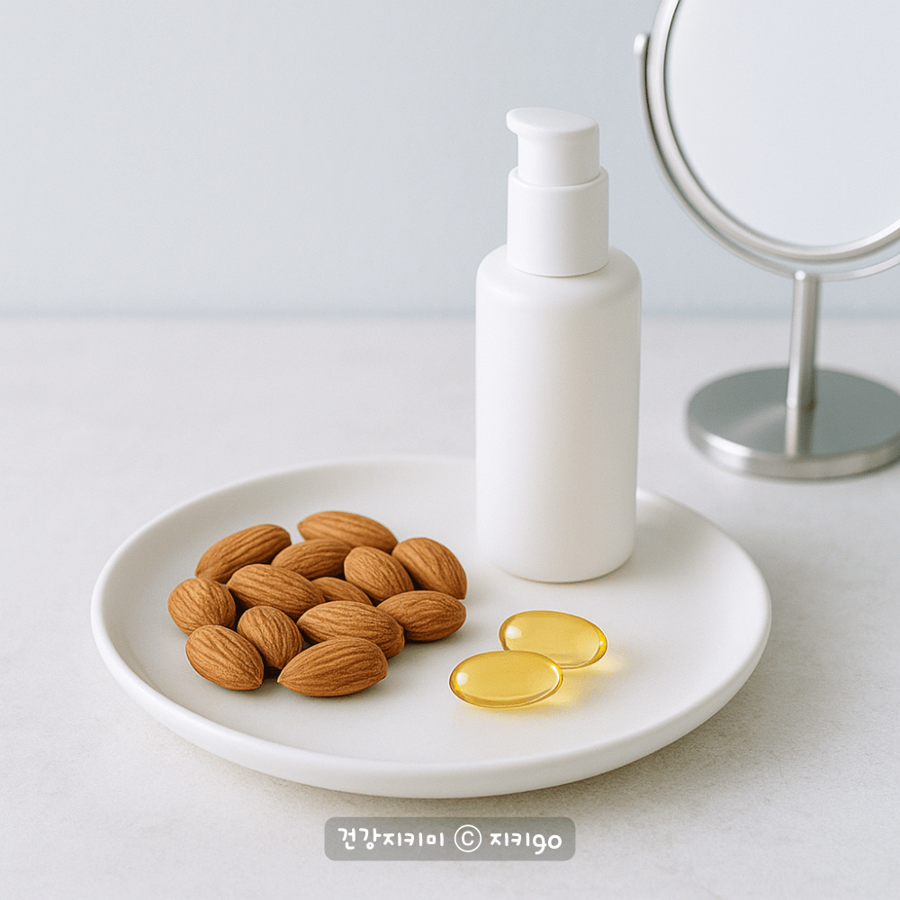 아몬드에 많이 들어 있는 비타민 E는 대표적인 항산화 성분으로 피부를 자외선으로부터 보호하고 노화를 늦추는 데 도움을 줍니다. 꾸준히 섭취하시면 피부 탄력 개선, 잡티 완화, 주름 예방에 긍정적인 영향을 줍니다. 또한 항산화 작용으로 세포 손상을 줄여주어 전반적인 노화 방지에도 효과가 있습니다.