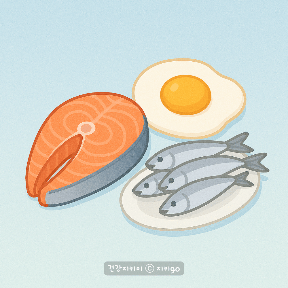 연어, 고등어, 참치 같은 등푸른 생선, 달걀 노른자 등이 있어요. 햇볕을 통한 비타민D 합성도 도움이 되므로 적절한 야외 활동을 병행하는 것이 가장 좋습니다.