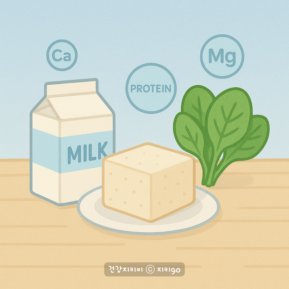 뼈는 칼슘 뿐만 아니라 단백질과 마그네슘도 필요해요. 견과류, 콩류, 달걀, 살코기를 균형 있게 섭취해주시면 뼈 건강 유지에도 효과적입니다.