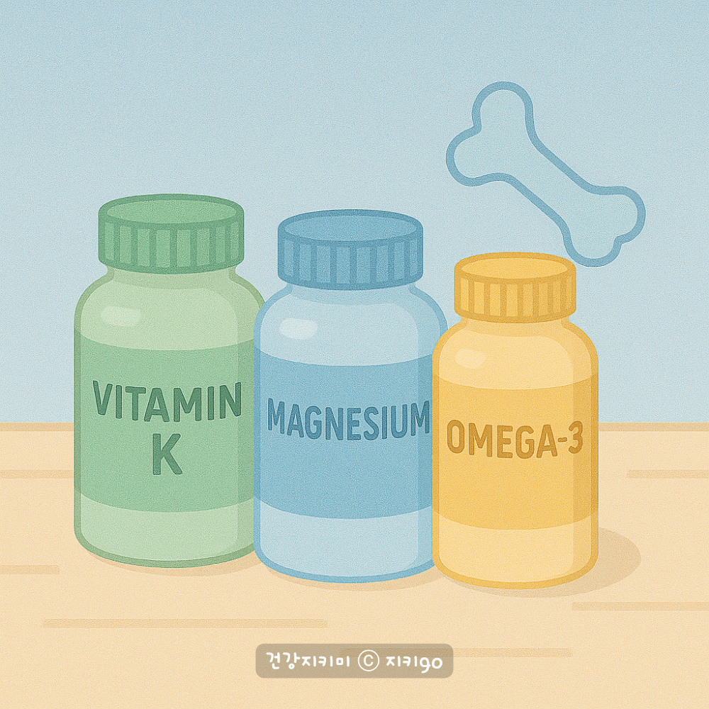 비타민K, 마그네슘, 오메가3는 뼈 형성에 도움을 주거나 뼈 손실을 막아주는 보조 영양제로 함께 고려하시면 좋으실것 같아요.