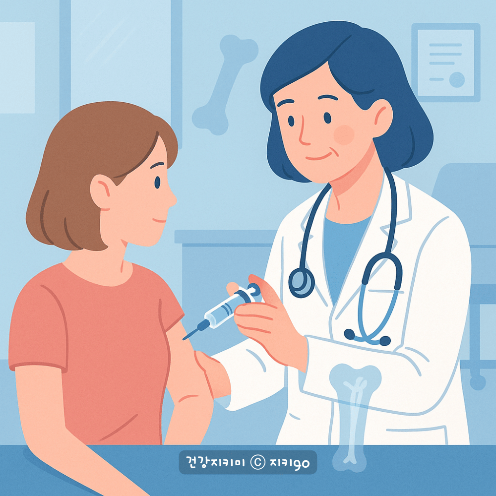식단 관리와 영양제만으로 효과가 부족하거나 골다공증이 이미 진단된 경우에는 주사 치료를 병행하기도 합니다. 대표적인 주사 치료제는 비스포스포네이트 제제, 데노수맙(프롤리아), 부갑상선호르몬 제제 등이 있어요.
