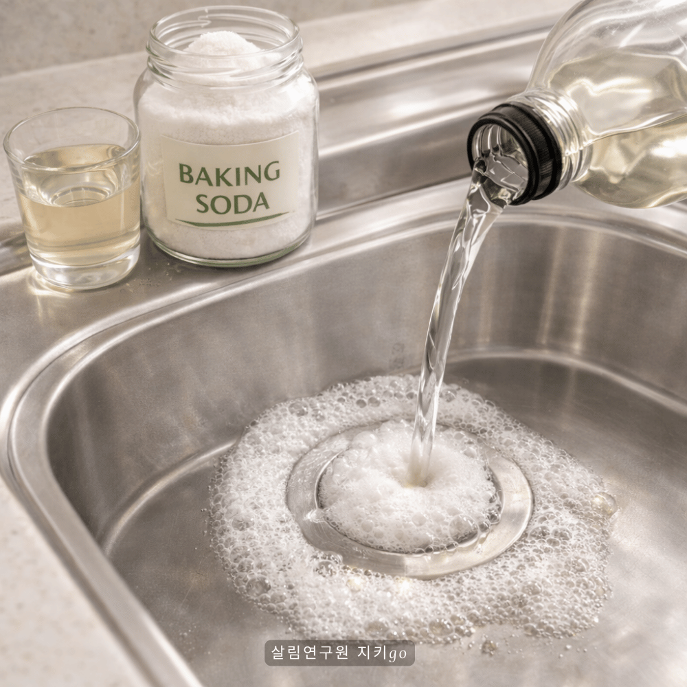 - 배수구에 베이킹소다 2~3큰술을 넣습니다.